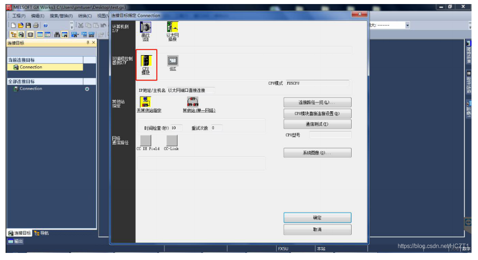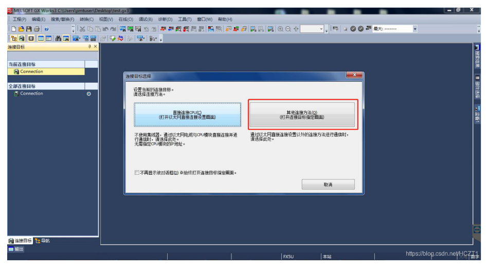 打開(kāi)GXWORKS 3,點(diǎn)擊當(dāng)前連接目標(biāo)下的【Connetion】,連接目標(biāo)選擇【其他連接方式】