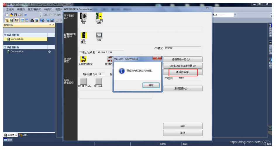 點(diǎn)擊【通信測(cè)試】,提示“已成功與FX5UCPU連接”。