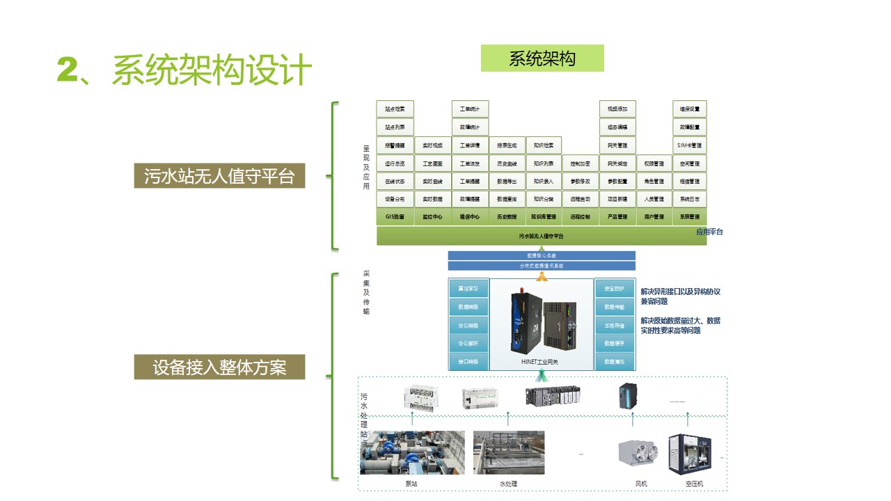為了解決在工廠在污水中間提升處理過程中存在的能耗、成本、安全、設備管理、勞動生產率等方面的問題。華辰智通推出了”無人值守”污水站智能化遠程管理平臺.通過在污水站重點處理單元乃至全流程實施智能控制,根據進水負荷及運行工況自動執行參數調節,優化運行條件,降低物能消耗,同時發揮區域化集中管理的優勢,采用統一巡檢、集中維修的管理方式。通過設計污水處理站物聯網系統,規劃系統總體架構和重點功能模塊,并結合系統應用從運行監控、報警應急指揮、生產巡檢、設備運維、績效管理等方面,逐步建立“無人值守”的污水站智能化運行管理模式。